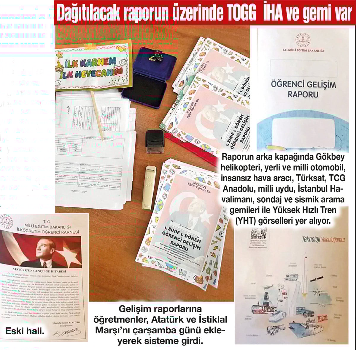 MEB, ilkokul birinci sınıf ve ikinci sınıflara Atatürk ve İstiklal Marşı olmayan raporları bugün dağıtacaktı. Çarşamba günü sisteme yükledikleri gelişim raporlarında, MEB tanıtımı ve iktidar propagandası yapılan hologramlara, Atatürk’ün hayatı ve cumhuriyet kazanımları yüklendi. Atatürk fotoğrafı da, gelişim raporlarına basıldı. “Beceri Edinim ve Gelişim Raporu” ile “Sosyal Etkinlik Raporu” adı altında ilkokul birinci ve ikinci sınıflardaki 2.3 milyon öğrenciye Atatürk fotoğrafı ve İstiklal Marşı olmayan, geride kalan 15 milyon öğrenciye ise Atatürk ve İstiklal Marşı olan karnelerin dağıtılması planlandı.