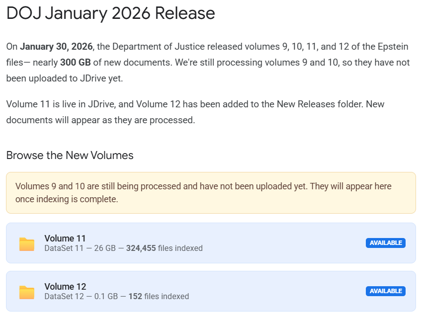 Öte yandan platformda yer alan bilgilere göre, 30 Ocak 2026'ta Adalet Bakanlığı tarafından yayımlanan 9–12'nci ciltler (yaklaşık 300 GB veri) halen indekslenme aşamasında ve 'Jmail' sistemine yükleniyor.