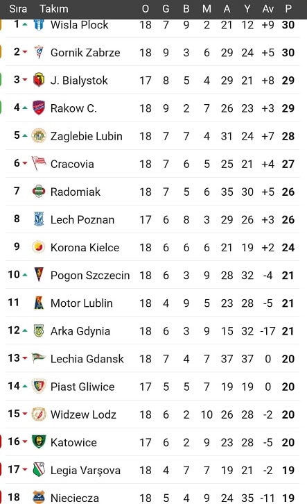 18 takımlı ligde lider ile düşme hattı arasındaki fark yalnızca 10 puan. Bu da birkaç haftalık galibiyet ya da mağlubiyet serisinin tüm sıralamayı altüst edebileceği anlamına geliyor. Ekstraklasa'da bu sezon "orta sıralar" ya da "rahat bölge" diye bir kavram kalmadı.