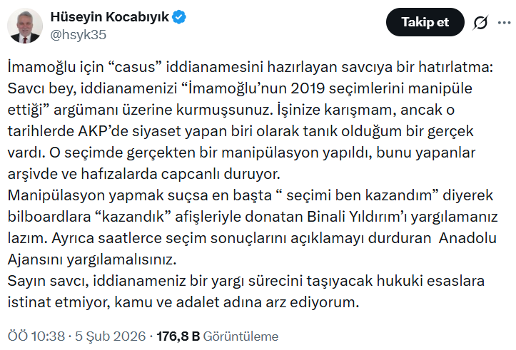 "İddianamenizi “İmamoğlu’nun 2019 seçimlerini manipüle ettiği” argümanı üzerine kurmuşsunuz. İşinize karışmam, ancak o tarihlerde AKP’de siyaset yapan biri olarak tanık olduğum bir gerçek vardı. O seçimde gerçekten bir manipülasyon yapıldı, bunu yapanlar arşivde ve hafızalarda capcanlı duruyor.