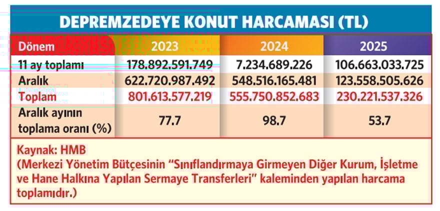 Ödemeler genellikle aralık ayına sıkıştırılmıştır. Bütçeden depremzede konutu için yapılan ödemelerin 2023 yılında yüzde 77.7’si, 2024 yılında yüzde 98.7’si ve 2025 yılında yarısından fazlası aralık ayında gerçekleştirilmiştir. Depremzede için konut ödemeleri adeta Hazine’nin nakit dengesine göre ayarlanmış gözükmektedir.