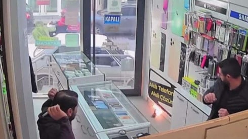 Konya'nın Beyşehir ilçesinde tamire getirilen cep telefonunun bataryası patlayıp alev aldı. O anlar, iş yerinin güvenlik kamerasına yansıdı.